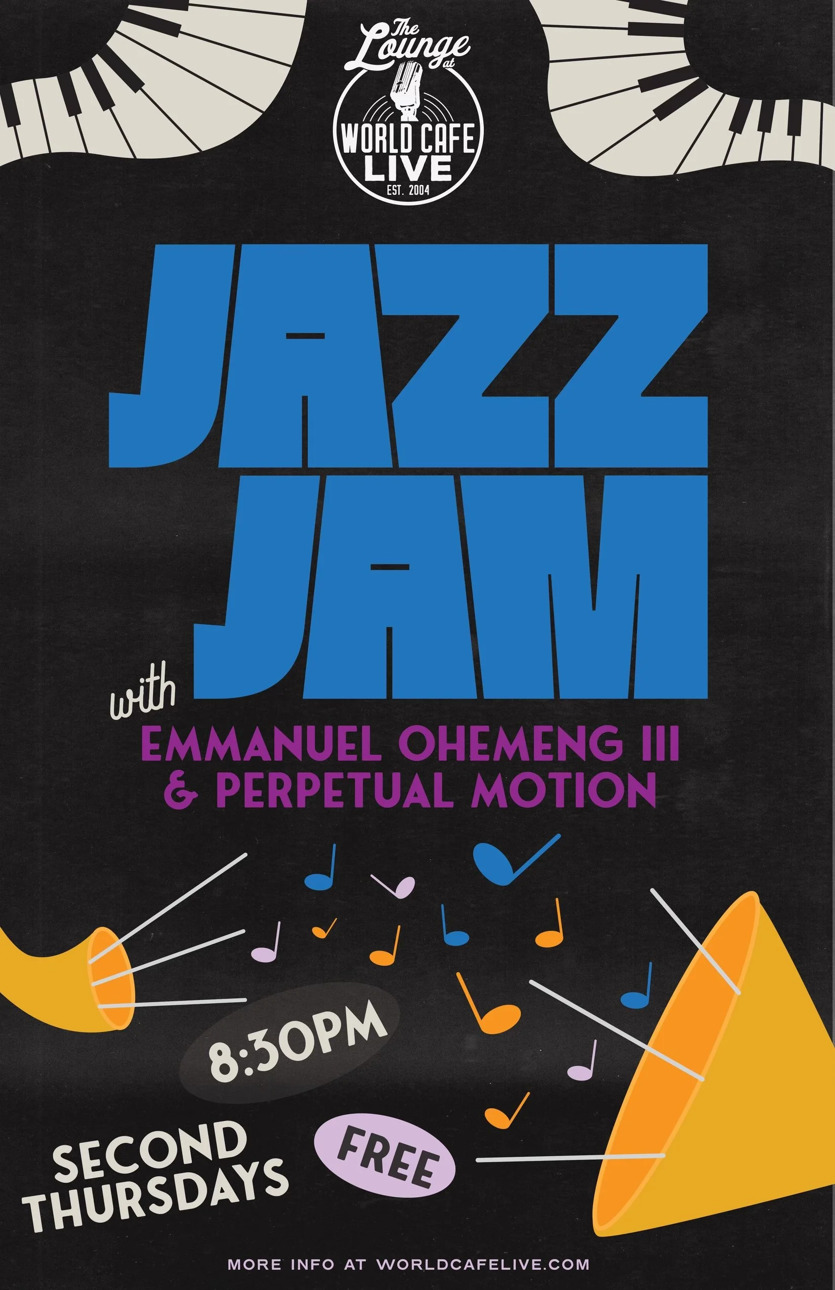 In 2023, Emmanuel Ohemeng 3rd and Perpetual Motion completed their yearlong residency at the renowned World Cafe Live Philadelphia. On behalf of the Perpetual Motion Band, Emmanuel would like to formally thank every staff member, server, and audience member for their great energy and endless support. As a frequent performer at World Cafe Live Philadelphia, be on the look out for future Perpetual Motion performances here!